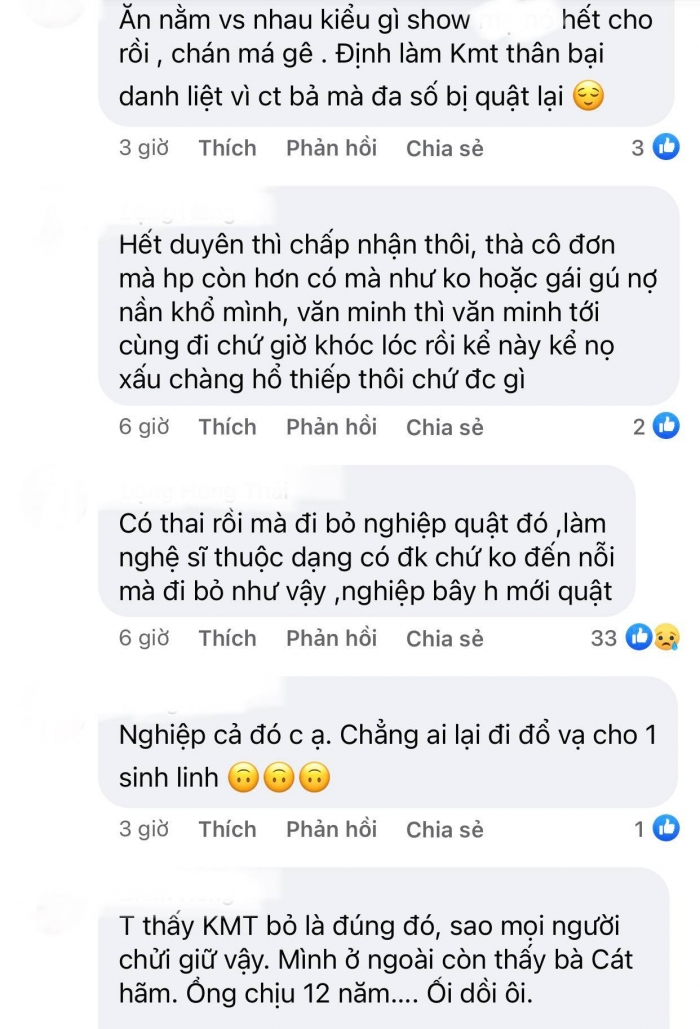 Không chỉ thế, khán giả còn cho rằng việc Cát Phượng bị Kiều Minh Tuấn “đá” chính là hậu quả của việc cô bỏ con hơn 10 năm về trước. Trước những ý kiến từ cư dân mạng, nữ diễn viên vẫn chưa có bất cứ phản hồi nào.