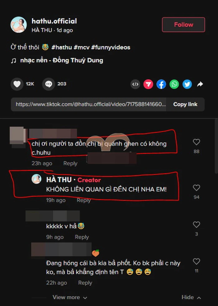 Sau khi nắm được việc thông tin bị sai lệch, phía Á hậu Hà Thu cũng lập tức có phản hồi trước những bình luận của cư dân mạng, phủ nhận chuyện bị đánh ghen. “Không biết ai đồn rồi lôi tên chị Thu vào. Lúc đó chúng tôi không có ở TP.HCM. Mọi người thấy có tên Hà Thu nên gửi rồi chúng tôi mới biết có vụ đó”, em gái Á hậu Đại dương 2014 cho hay.