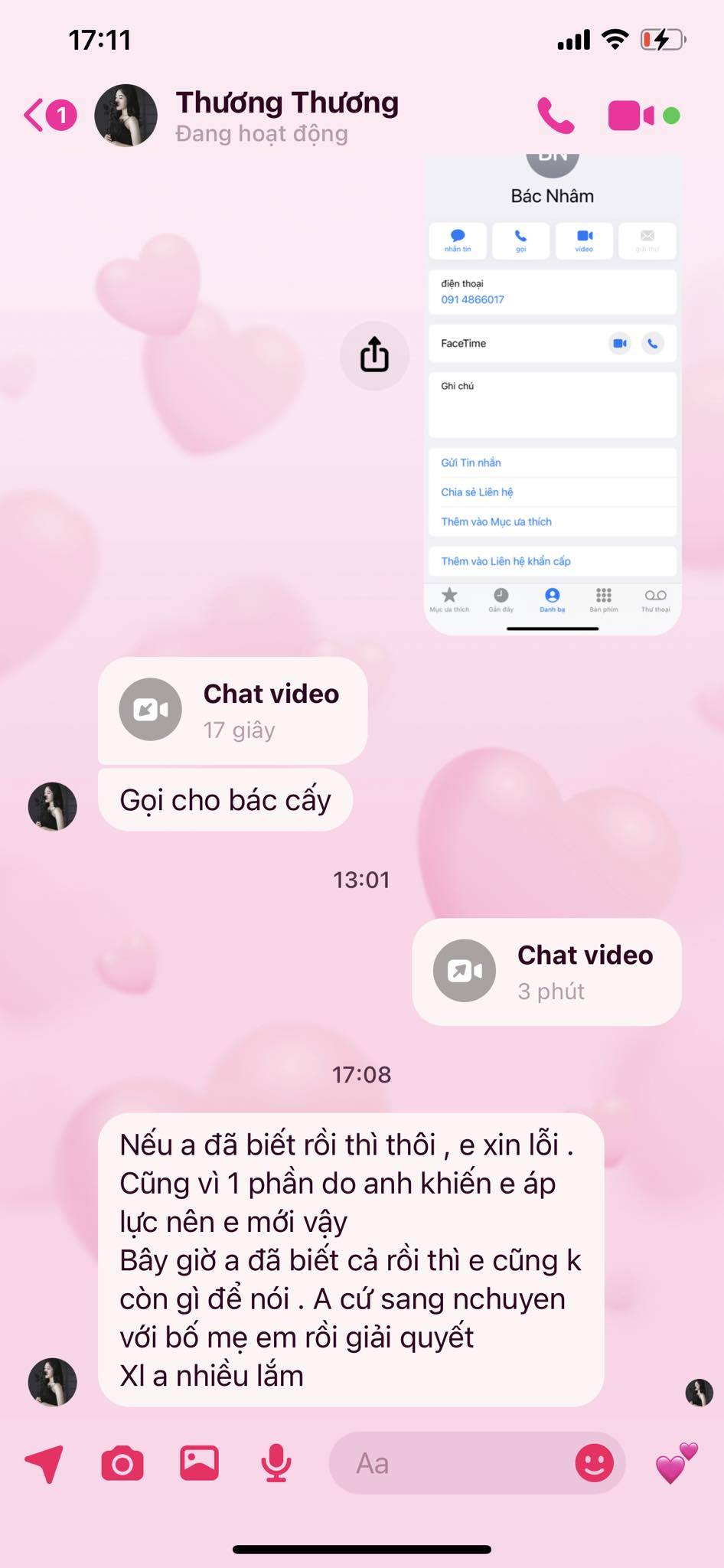 Trên trang cá nhân, anh chồng bức xúc viết: “Chồng chiều như chiều vong, vợ vẫn cặp kè với U60. Kèm theo đó là đoạn tin nhắn “chứa đựng” lời giải thích của người vợ: “Nếu anh đã biết rồi thì thôi, em xin lỗi. Cũng vì một phần do anh khiến em áp lực nên em mới vậy. Bây giờ anh đã biết cả rồi thì em cũng không còn gì để nói. Anh cứ sang nói chuyện với bố mẹ em rồi giải quyết. Xin lỗi anh nhiều lắm”.