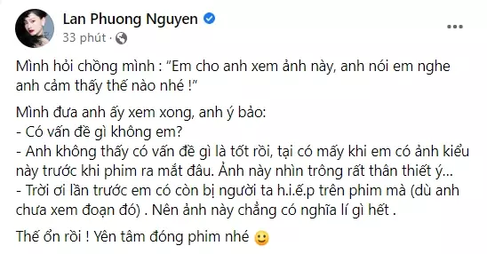 Nữ diễn viên “Thương ngày nắng về” tiết lộ thêm rằng từ trước đến nay không nói trước với ông xã về những cảnh quay, tuy nhiên bức ảnh này ôm khá thân thiết nên muốn xem phản ứng của chồng. “Trời ơi lần trước em có còn bị người ta cưỡng hiếp trên phim mà (dù anh chưa xem đoạn đó). Nên ảnh này chẳng có nghĩa lí gì hết”, ông xã Lan Phương trả lời. Trước phản ứng của chồng, cô bày tỏ: “Thế ổn rồi! Yên tâm đóng phim nhé!”.