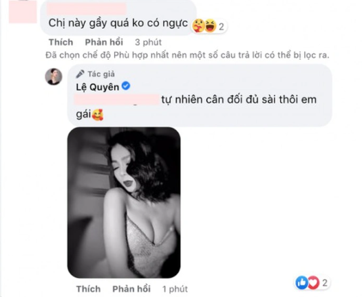 Mới đây khi đăng tải bộ ảnh bikini 2 mảnh nhỏ xíu lên mạng xã hôi, Lệ Quyên khiến dân tình phải ngỡ ngàng vì độ quyến rũ và táo bạo từ bộ đồ. Tuy nhiên ngoài những lời nhận xét tích cực thì nữ ca sĩ cũng vấp phải một vài bình luận tiêu cực từ anti-fan. Trong đó có một tài khoản thẳng thừng nhận xét Lệ Quyên: “Chị này gầy quá không có ngực”. Tưởng chừng sẽ ngó lơ lời bình luận tiêu cực như mọi lần nhưng Lệ Quyên đã đáp trả một cách vô cùng văn minh.