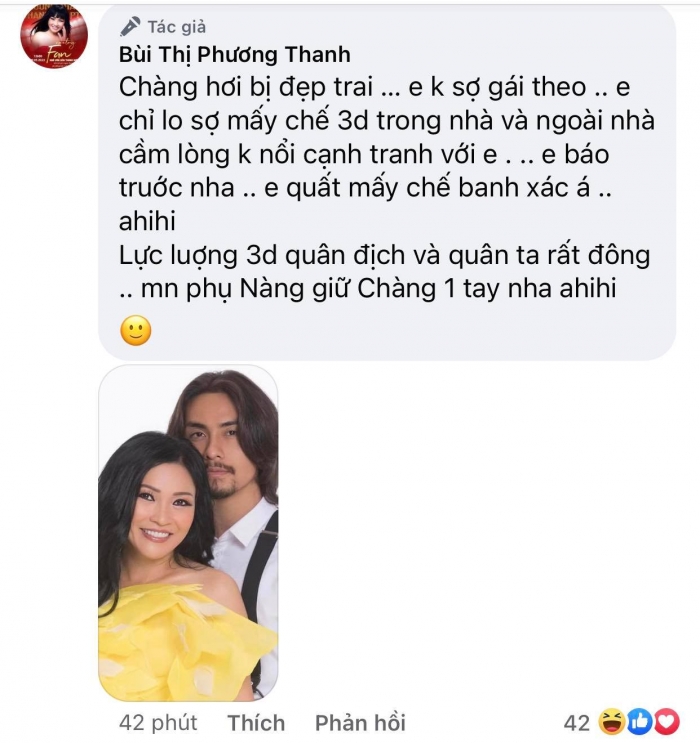 Ở dưới phần bình luận bài viết, Phương Thanh còn thẳng thắn để lại lời “cảnh báo” rằng: “Chàng hơi bị đẹp trai … em không sợ gái theo. Em chỉ lo sợ mấy chế 3d trong nhà và ngoài nhà cầm lòng không nổi cạnh tranh với em. Em báo truớc nha, em quất mấy chế banh xác á.. chuy em tuơng tàn nha ahihi.. Lực luợng quân địch và quân ta này đông khủng khiếp. Mọi người thuơng em giữ phụ Chàng dùm em nha.. ahihi”.