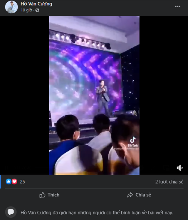 Cùng với đó, tối muộn 16/5, Facebook này còn chia sẻ clip một phần biểu diễn của Ngọc Sơn. Bài đăng này chỉ thu hút lượt like thấp lẹt đẹt, không có bình luận vì Hồ Văn Cường đã giới hạn người có thể bình luận bài viết.