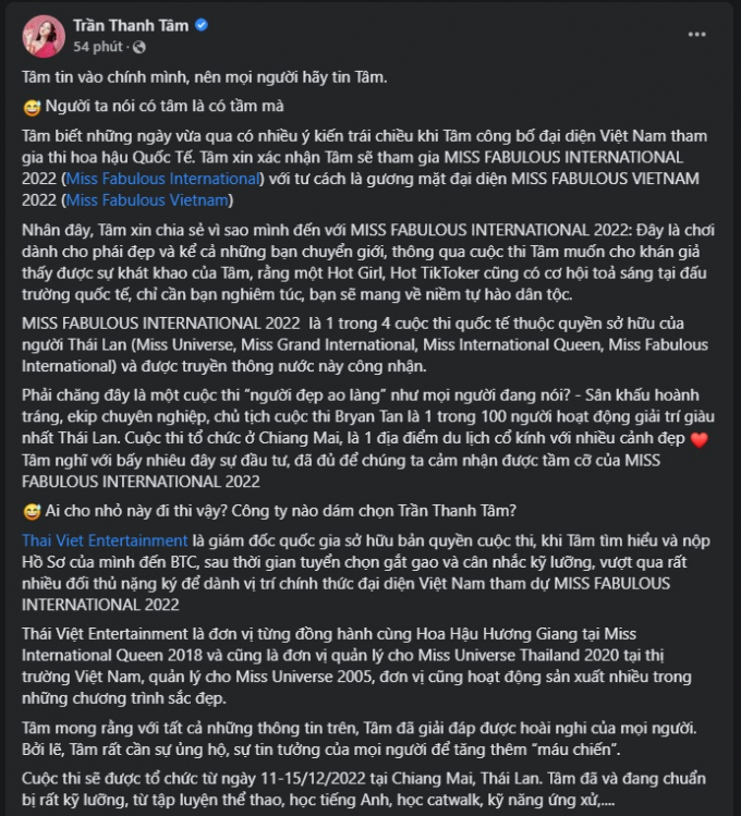 Có lẽ lo sợ độ nhận diện thương hiệu của Miss Fabulous International chưa đủ lớn, hot girl trứng rán đăng tải bài viết khá dài để khán giả có thể theo dõi và hiểu rõ hơn về cuộc thi, cũng như ngầm khẳng định không hề “ao làng” như mọi người nghĩ.