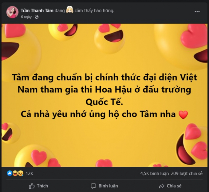 Những ngày vừa qua , Trần Thanh Tâm đã có bài viết gây sự chú ý của công chúng khi “thả thính” tham gia thi hoa hậu ở đấu trường quốc tế. Ngay lập tức nổ ra cuộc tranh luận nảy lửa, hầu hết là ngăn cản hot girl đừng nên tham gia. Số khán giả còn lại thì “đoán già đoán non” danh tính cuộc thi, ý kiến cho rằng chắc chắn không phải một cuộc thi lớn trong Big 8 (beauty pagent).
